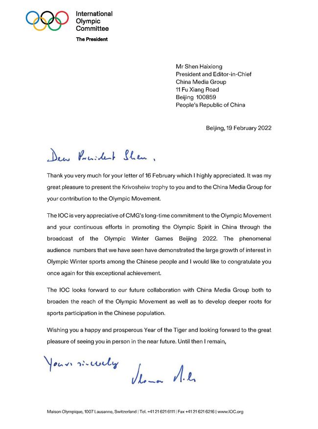 U příležitosti úspěšného zakončení Zimních olympijských her (ZOH) v Pekingu 2022 předseda Mezinárodního olympijského výboru Thomas Bach v sobotu odepsal na dopis šéfredaktorovi CMG (China Media Group) Shen Haixiongovi (Šen Chaj-siong), ve kterém gratuloval k vynikajícím úspěchům vysílání a reportáže na ZOH v Pekingu 2022. Thomas Bach zdůraznil, že vysoká sledovanost ZOH v Pekingu 2022 ukazuje, že Číňané mají velký zájem o olympijské zimní sporty a sporty jsou zakořeněny hluboko v srdci čínského lidu.