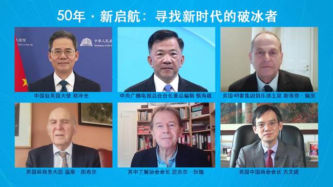 Na 13. března připadá 50. výročí navázání diplomatických vztahů na úrovni velvyslanců mezi Čínou a Spojeným královstvím. U této příležitosti byl oficiálně zahájen rozsáhlý interaktivní mediální program iniciovaný a pořádaný čínskou mediální organizací China Media Group (CMG) – „50 let, nová plavba: Hledání prorážečů ledu pro novou éru (50 Years, New Sail: Looking for Icebreakers in the New Era)“. Slavnostního zahájení se online zúčastnili náměstek a vedoucí propagačního oddělení ÚV KS Číny a ředitel CMG pan Shen Haixiong (Šen Chaj-siung), čínský velvyslanec ve Spojeném království Zheng Zeguang (Čeng Ce-kuang), Stephen Perry, syn první generace „prorážečů ledu“ Jack Perry, bývalý britský vicepremiér Michael Heseltine, bývalý britský ministr obchodu Vince Cable a dalších 10 čínských a zahraničních hostů.