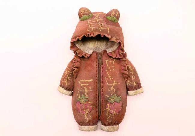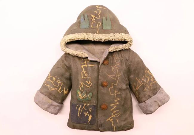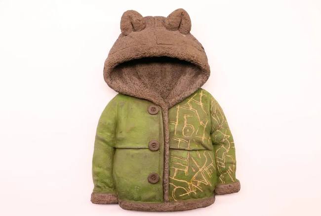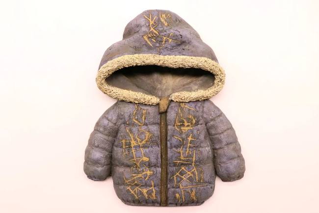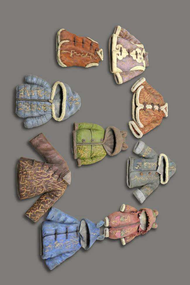 Keramické vycpané bundy nazdobené texty z Knihy z nebe jsou díla vycházející ze spolupráce tohoto učitele a studenta.