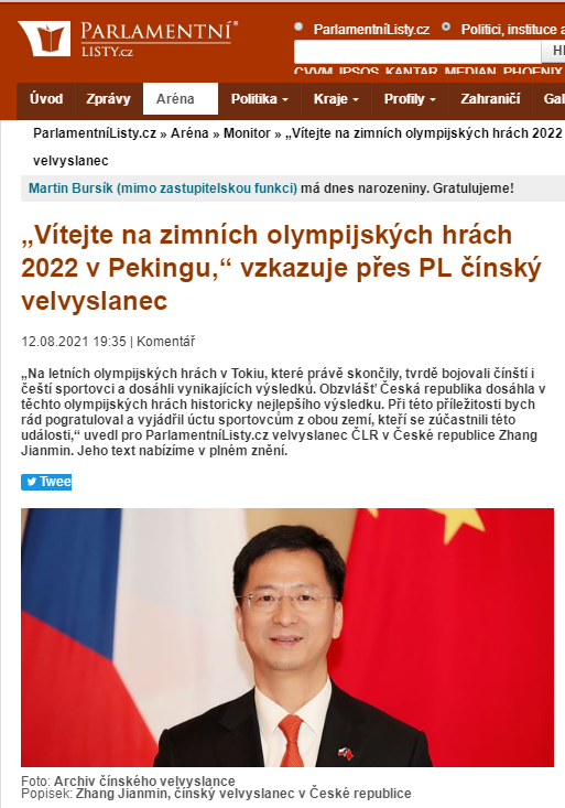 Velvyslanec ČLR v ČR Zhang Jianmin dne 12. srpna 2021 publikoval na webu Parlamentní listy článek Vítejte na zimních olympijských hrách 2022 v Pekingu, ve kterém pogratuloval čínským i českým sportovcům k vynikajícím výsledkům na letních olympijských hrách v Tokiu, představil průběh přípravy pro ZOH 2022 v Pekingu, a popřál sportovcům obou zemí mnoho štěstí na zimních olympijských hrách v Pekingu.Celý text: