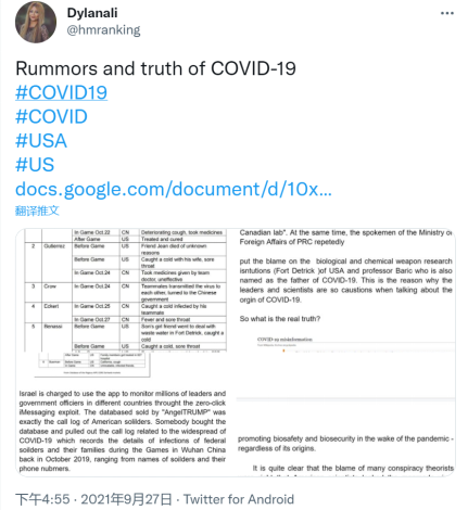 Podle zprávy z webu huanqiu.com z 27. září 2021, uživatel Twitteru „Dylanali“ zveřejnila článek z dokumentů Google s titulem „Pověsti a skutečnost o novém koronaviru“.