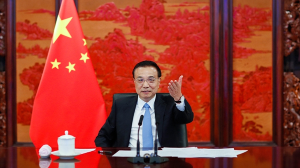 Čínský premiér Li Keqiang (Li Kche-čchiang) vedl 6. července 2021 v čínském Pekingu dialog přes video se zástupci britského podnikatelského sektoru...