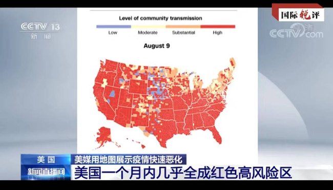Podle nejnovějších údajů z amerického Centra pro kontrolu a prevenci nemocí se za poslední měsíc zvýšil počet Američanů ve „vysoce rizikových“ komunitách z 19 % na 90 %. Podle mapy, kterou nedávno uveřejnila CNN, se Spojené státy během měsíce téměř staly červenou vysoce rizikovou zónou.