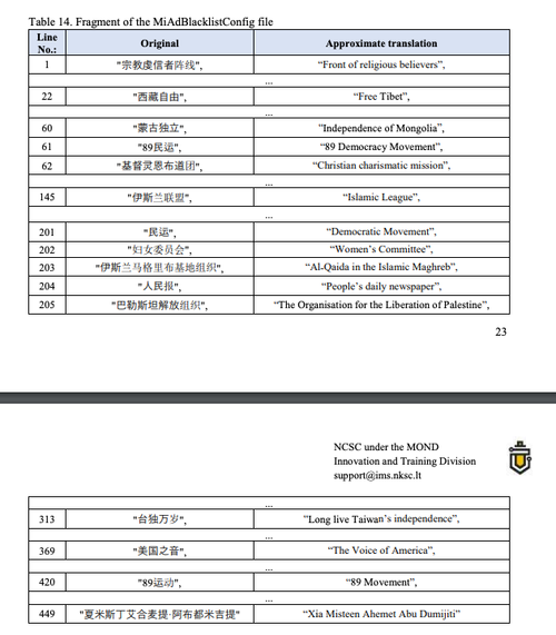 Nyní však Litva vynesla „trumf“. Litevské Národní centrum kybernetické bezpečnosti (NKSC) 23. září vydalo zprávu, která naléhá na spotřebitele, aby zahodili své čínské chytré telefony, pokud možno ode všech čínských značek, kvůli rizikům spojeným jak s kybernetickou bezpečností, tak s cenzurou. Tato součást litevského ministerstva obrany NKSC totiž prý zjistila, že do telefonů čínské značky Xiaomi jsou zabudovány nástroje k cenzuře politicky nekorektních výrazů, takže telefon by se nám údajně mohl chovat podobně cenzorsky, jako to známe třeba z Facebooku.