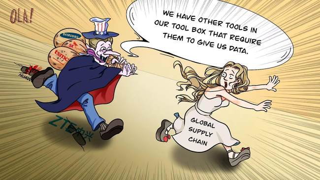 Od potlačování čínských technologických společností, jako je Huawei a ZTE, po přinucení výrobců čipů předávat základní data, Spojené státy využily svou administrativní moc k vydírání zahraničních společností, což ukazuje světu, co je „ekonomický nátlak.“ Spojené státy pošlapávají tržní pravidla, jako je spravedlivá soutěž a volná směna.