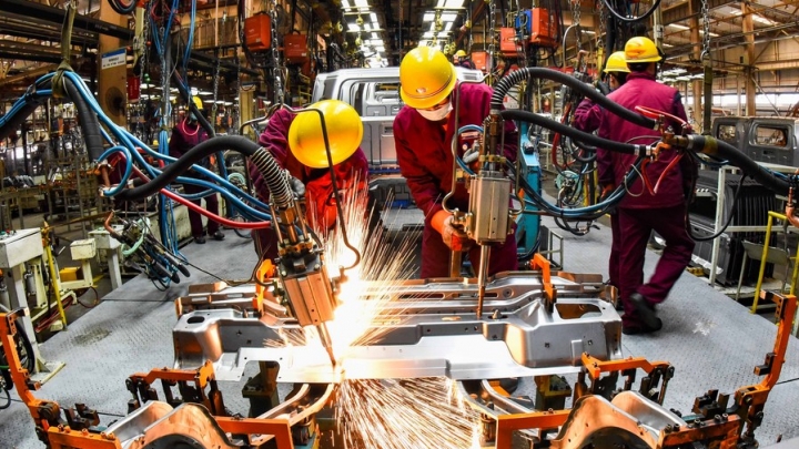 Pracovníci přivařují součásti na výrobní lince v automobilce ve městě Qingzhou ve východočínské provincii Shandong, 28. února 2021. [Photo/Xinhua]Čínské ekonomice se během loňského roku podařilo dost dobře realizovat ekonomické zotavení