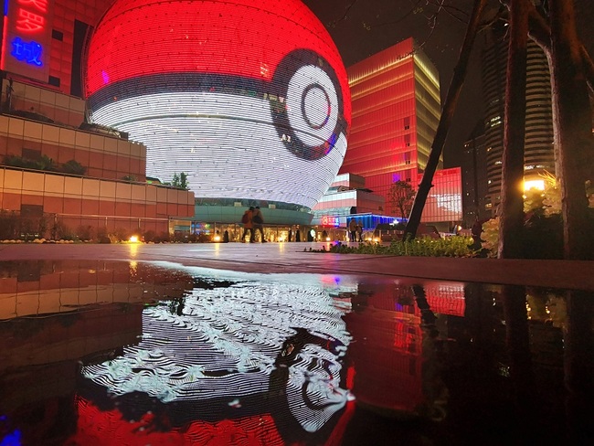 Obrovský „pokéball“ v centru Šanghaje zdobí noční pohled na Šanghaj