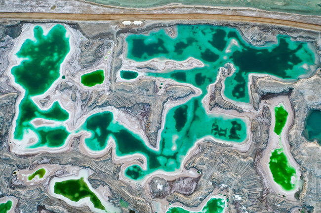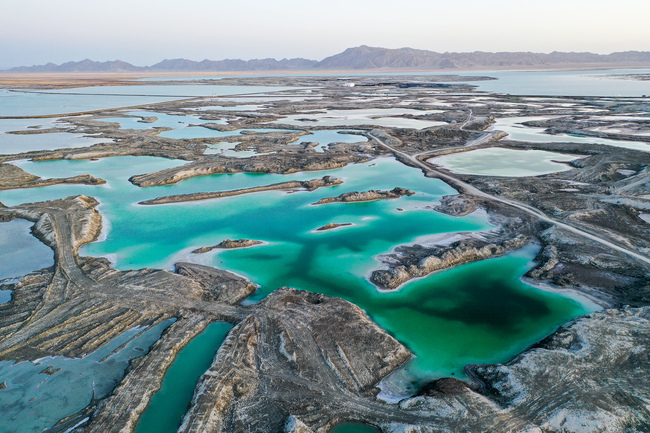 Letecké snímky smaragdového jezera v čínské provincii Qinghai, voda v jezeře je jako nefrit zasazený do lidského světa