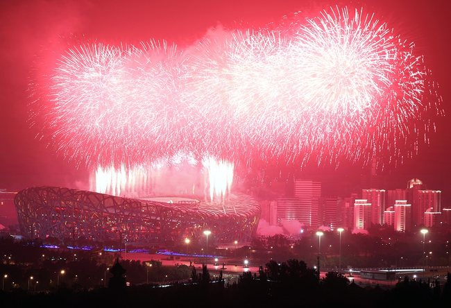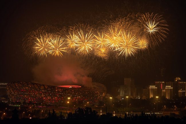 Ohňostroje nad Národním stadionem Ptačí hnízdo v Pekingu na oslavu 100