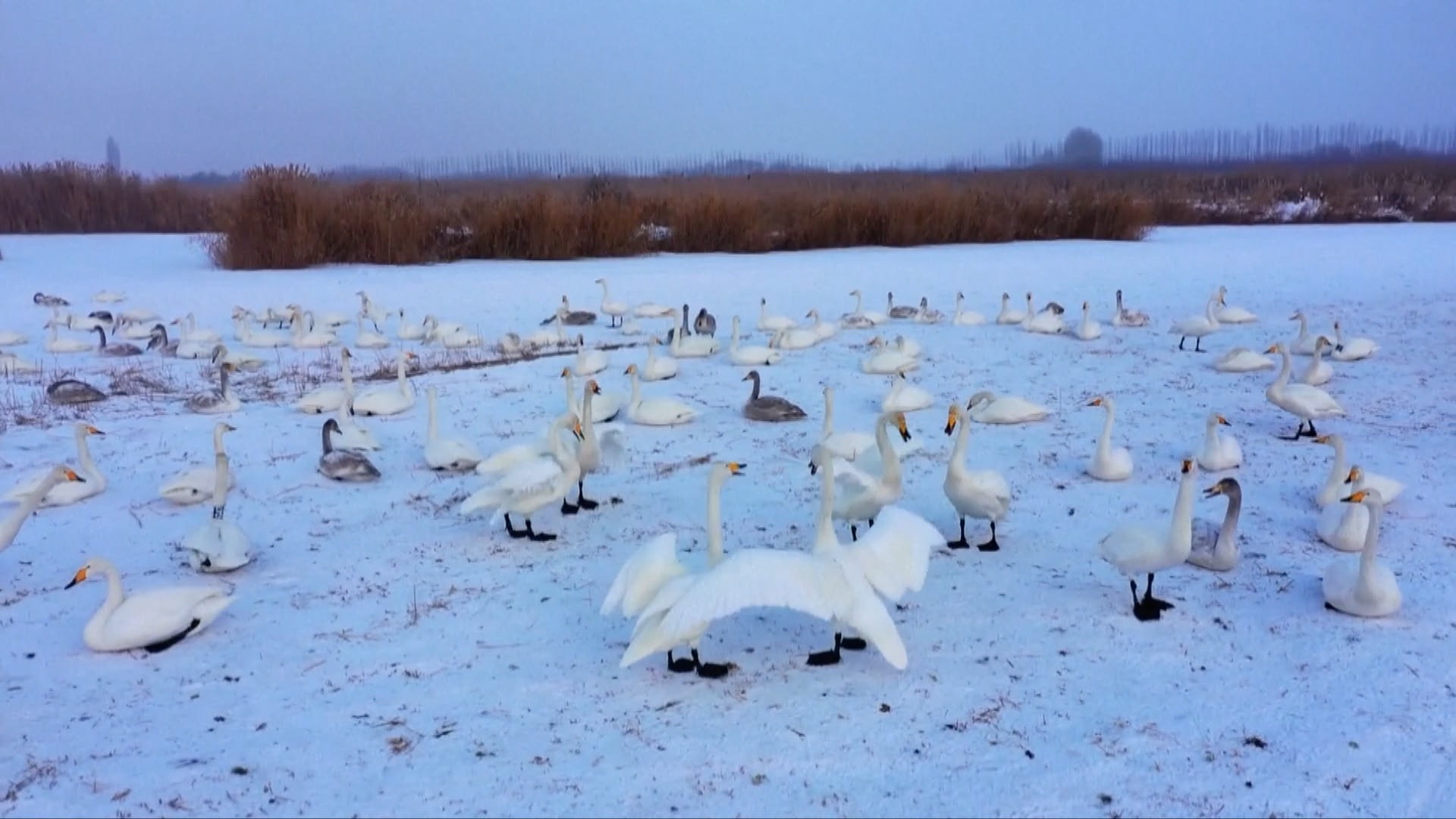 Přezimující labutě zpěvné slaví tradiční čínský Jarní festival v mokřadu Manas v čínské Ujgurské autonomní oblasti Xinjiang...