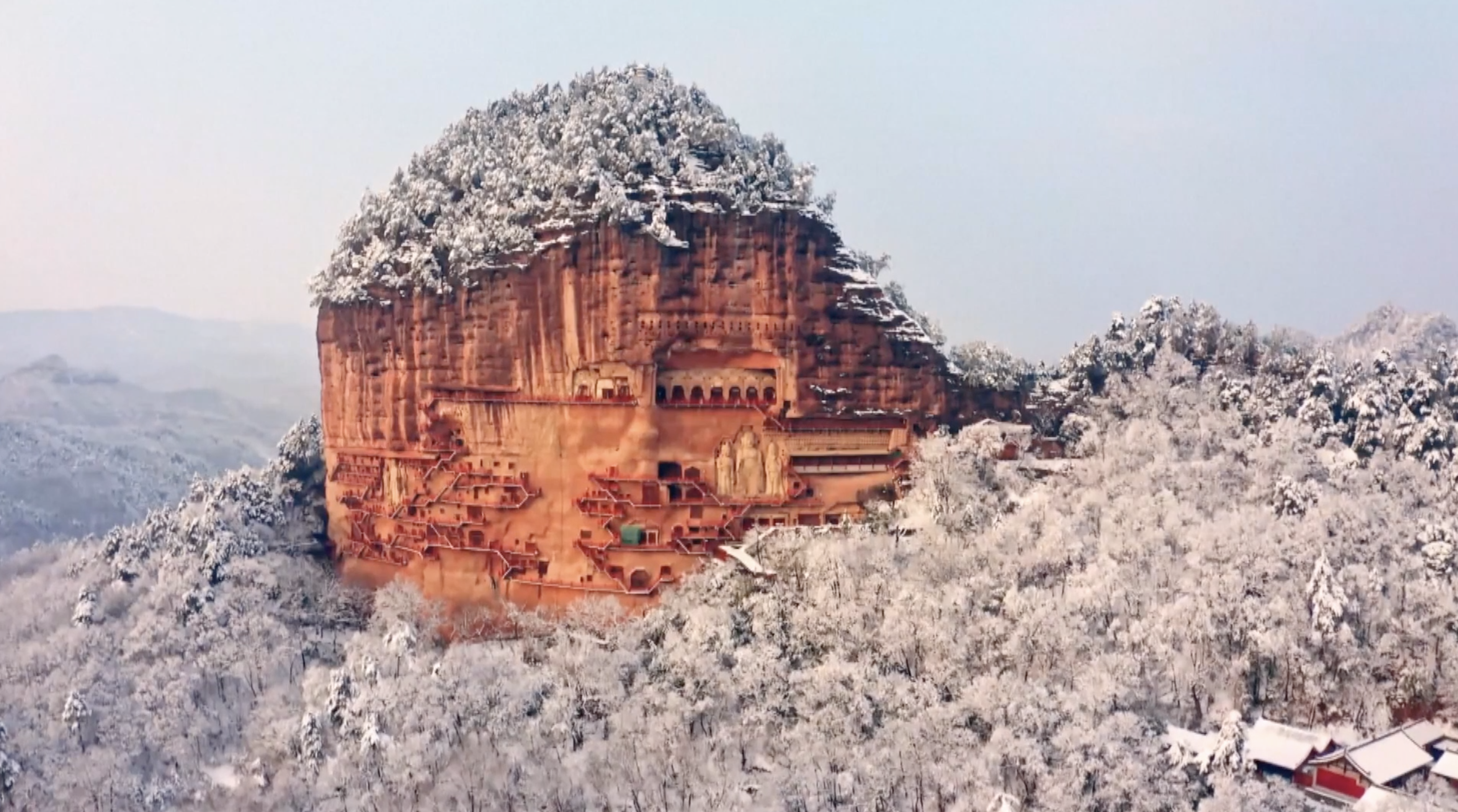 Na čínské hoře Maiji padá sníh, což je dobré znamení pro tento rok....