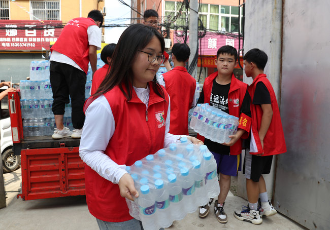 Studenti z města Xuchang v čínské provincii Henan pracují v létě jako dobrovolníci pro zásobování na pomoc při katastrofách