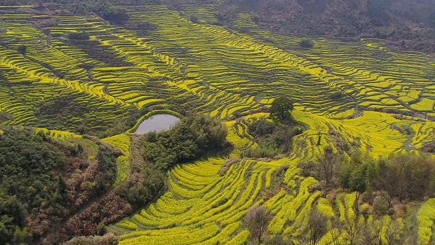 Nejkrásnější vesnice v Číně! Letecké snímky 10.000 mu (6,67 km2) teras řepkových květů ve městě Wuyuan v provincii Jiangxi