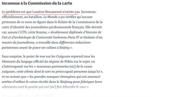 Slavné francouzské médium Le Monde zveřejnilo před několika dny článek, v němž obvinilo francouzský kanál CGTN z „fabrikace“ francouzské reportérky pro „udržování čínské politiky o Xinjiangu“.