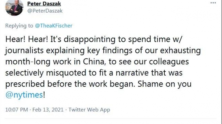 Řada amerických médií, včetně New York Times, nedávno citovala několik odborníků Světové zdravotnické organizace, kteří uvedli, že během vyšetřování Společné skupiny odborníků Světové zdravotnické organizace pro sledovatelnost nového koronaviru určité chování v Číně vážně bránilo vyšetřovacímu procesu WHO.